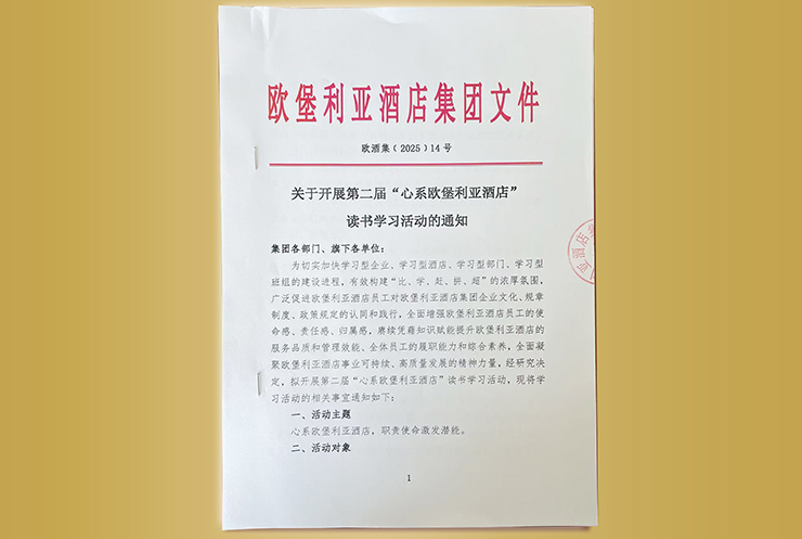 堡利亚酒店集团企业文化、规章制度、政策规定的认同和践行,全面增强欧堡利亚酒店员工的使命感、责任感、归属感,赓续凭藉知识赋能提升欧堡利亚酒店的服务品质和管理效能、全体员工的履职能力和综合素养,全面凝聚欧堡利亚酒店事业可持续、高质量发展的精神力量,2025年9月25日-9月29日,欧堡利亚酒店集团开展了以“心系欧堡利亚酒店,职责使命激发潜能”为主题的第二届“心系欧堡利亚酒店”读书学习活动,整个活动分为宣传发动、组织学习、报名准备、分类考核、阅卷统计五个阶段,有效实现了“全员参与、以学促知、以知促行”的活动目标。